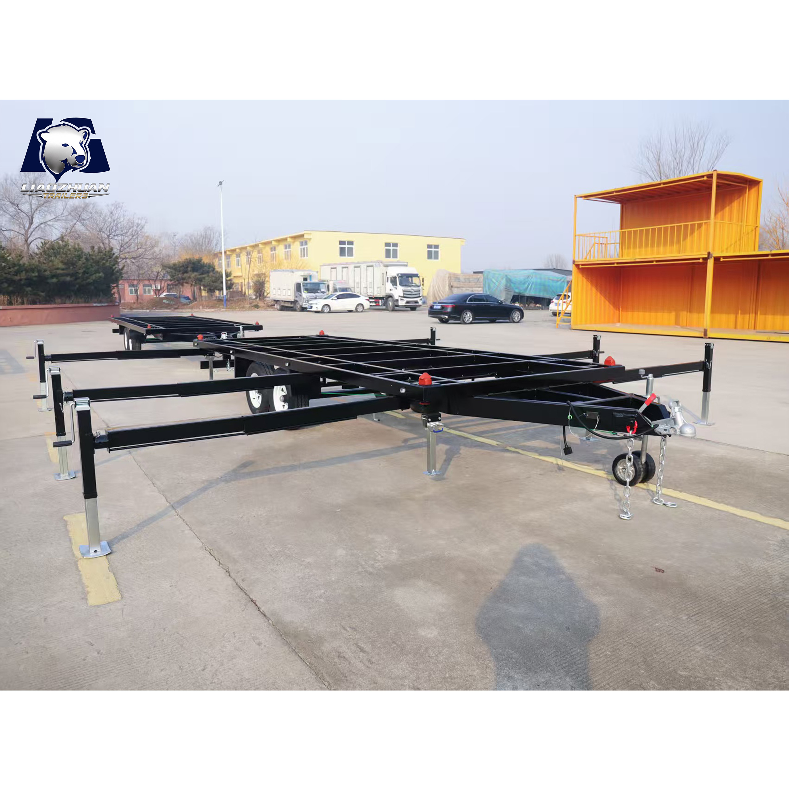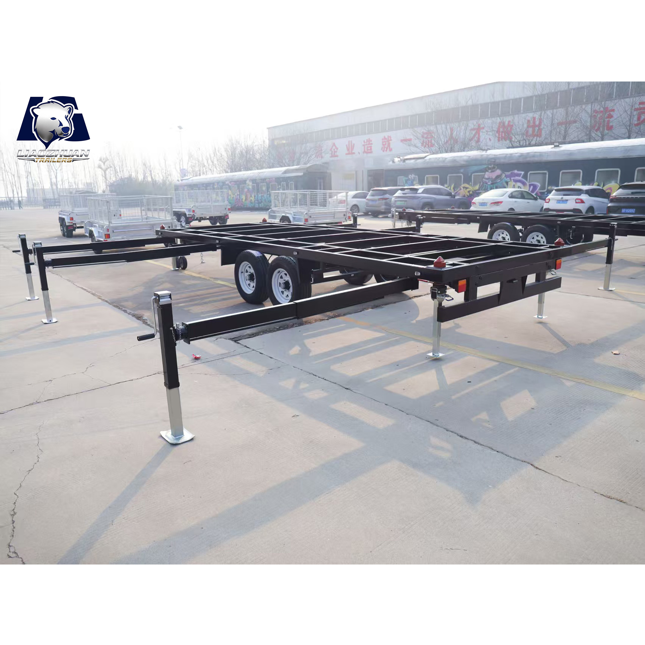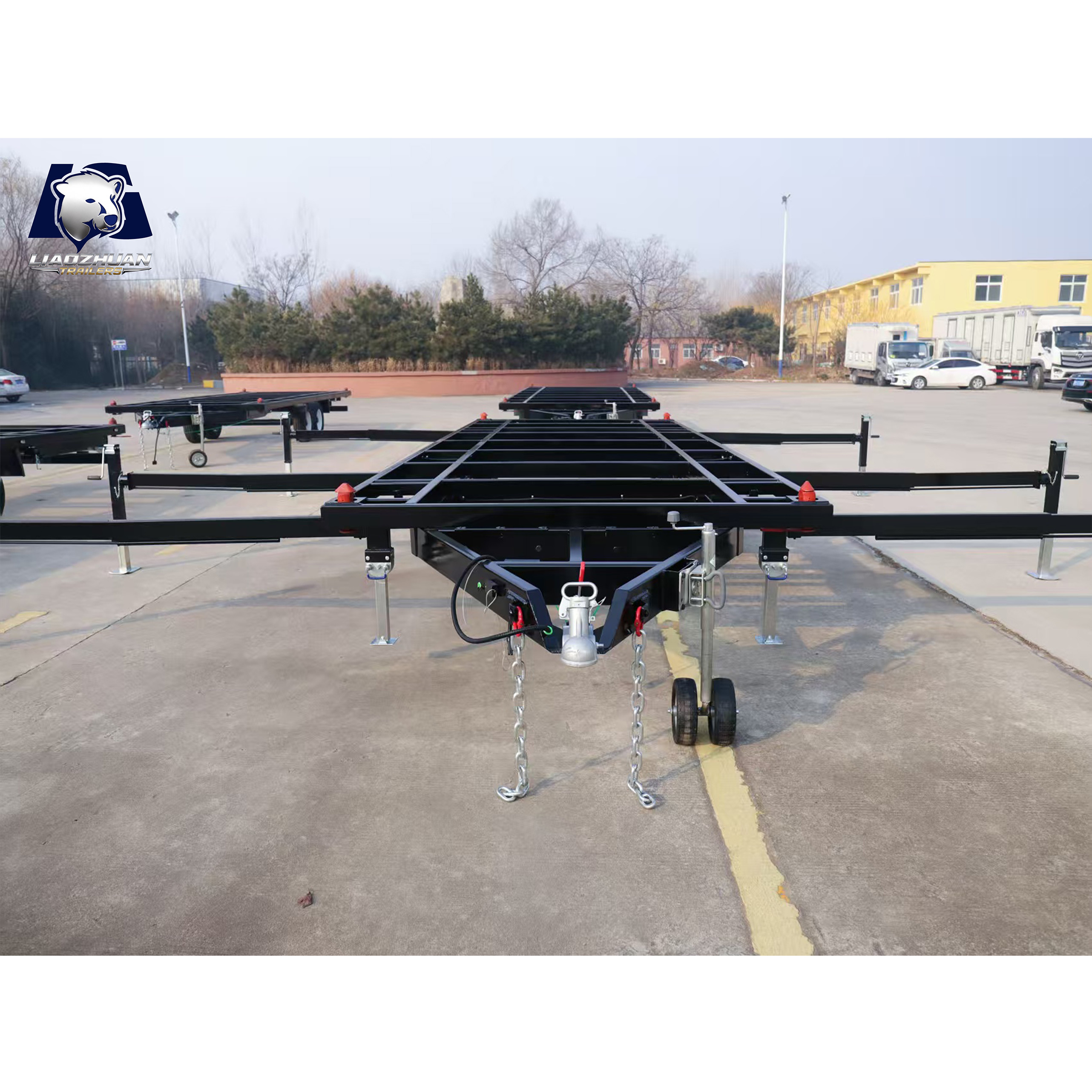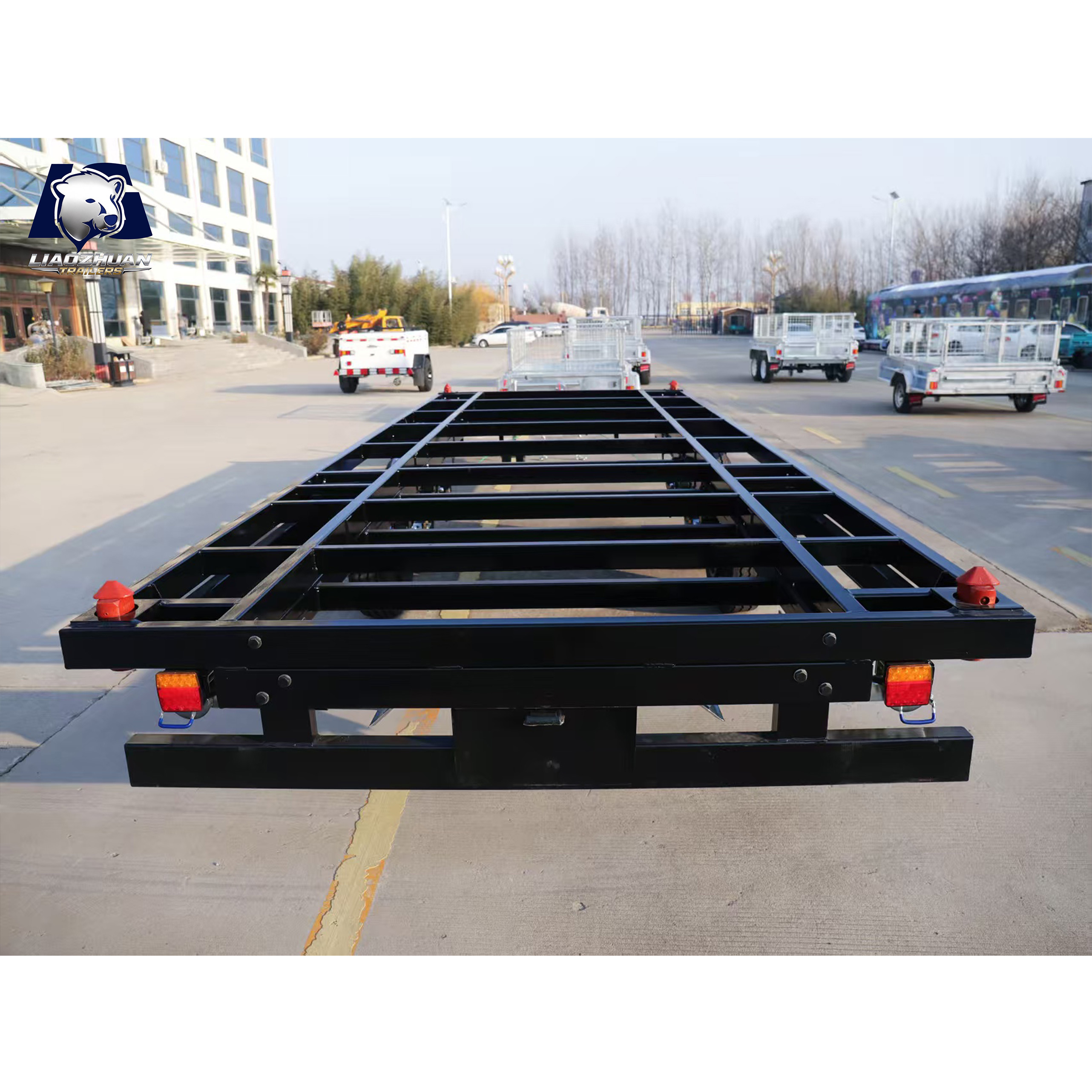 Dimensions of the trailer: 7280*2200*820mm Tow bar: 1300mm 150×50mm Internal size: 5900mm×2200mm×820mm Surface treatment: Spray molding Color: Black Lights: LED ADR lights Axle: Electric brake shaft ATM: 4500 kg Tare weight: 1100 kg Traction bar support: Heavy-duty outriggers Fully welded: Yes Leaf springs: 9-leaf rocker roller Beam: 80*40*2.5mm Steel pipe: Square tube Wheels and tires: 225/70R15LT Brake: 12-inch electric drum brake Adjustable support legs: ×4 External support leg:×6 Certification:9001/TS 16949、CCC、CE、ADR、DOT