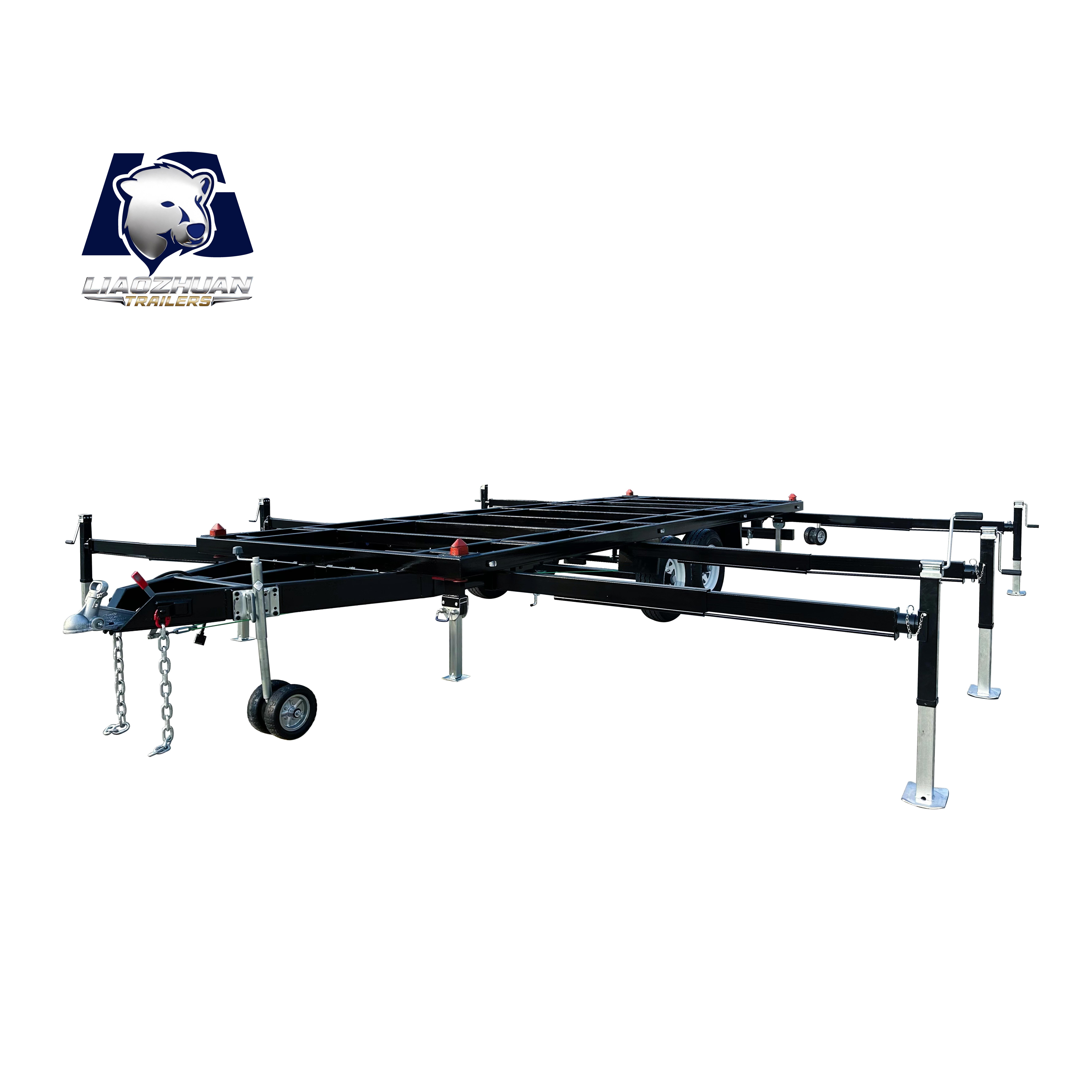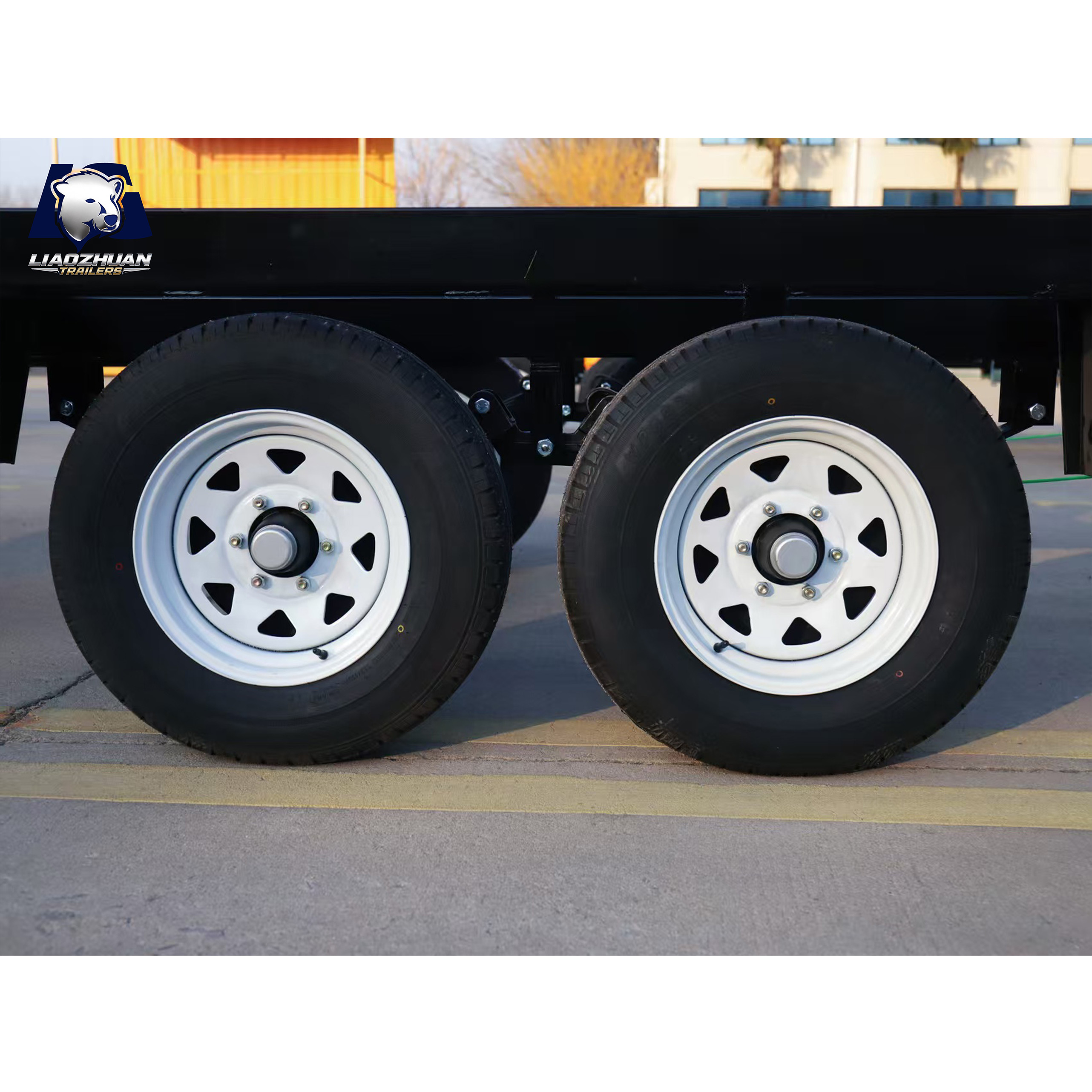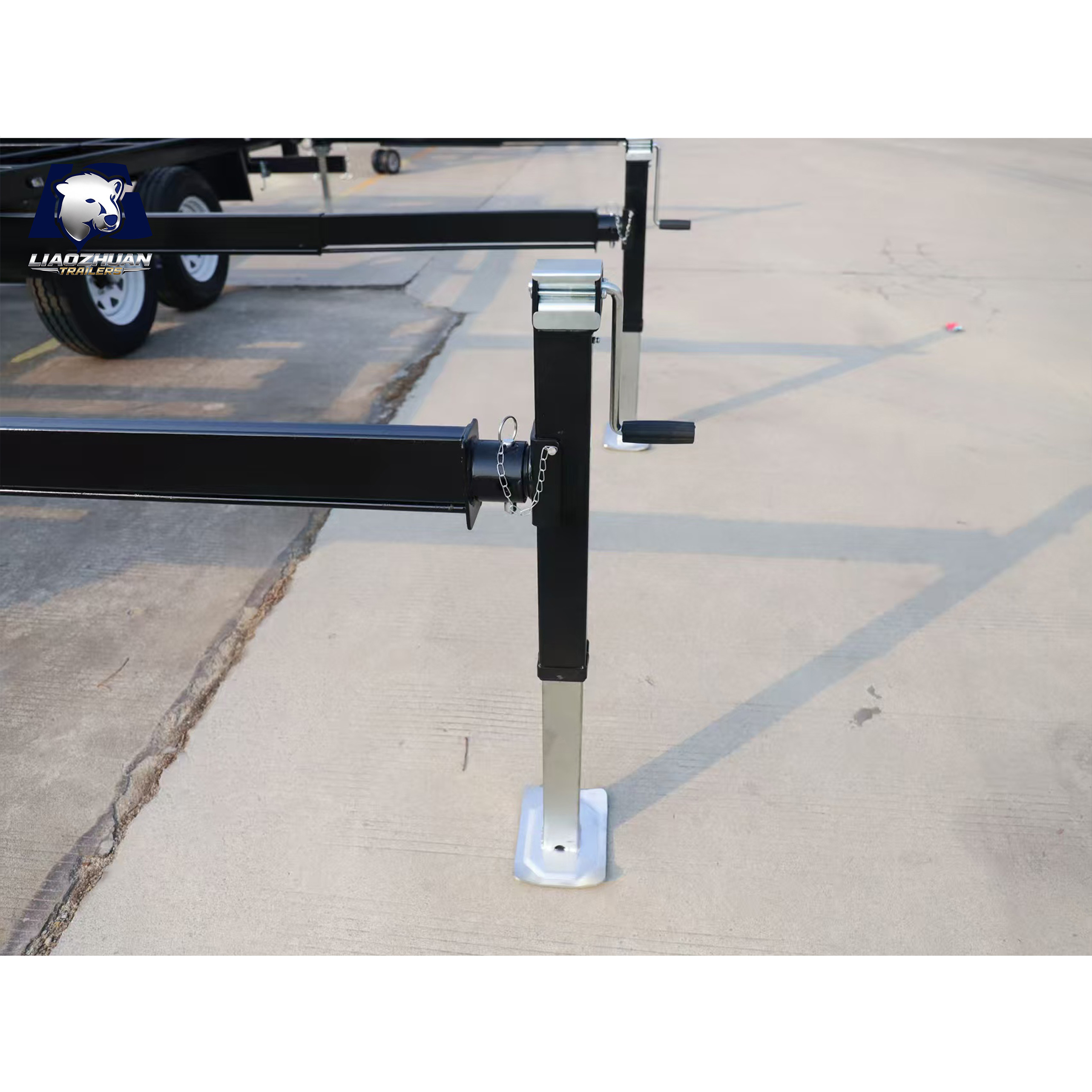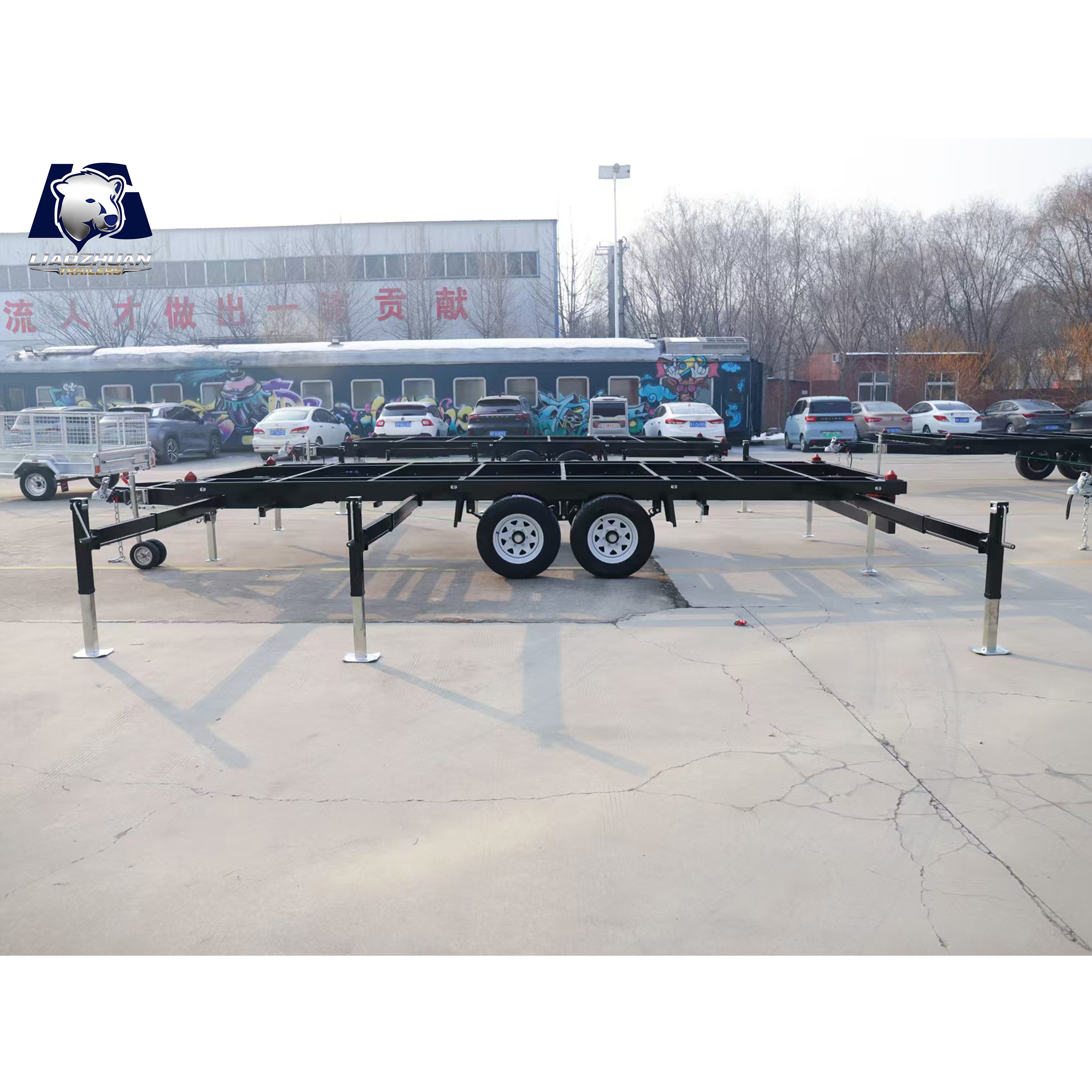 Dimensions of the trailer: 7280*2200*820mm Tow bar: 1300mm 150×50mm Internal size: 5900mm×2200mm×820mm Surface treatment: Spray molding Color: Black Lights: LED ADR lights Axle: Electric brake shaft ATM: 4500 kg Tare weight: 1100 kg Traction bar support: Heavy-duty outriggers Fully welded: Yes Leaf springs: 9-leaf rocker roller Beam: 80*40*2.5mm Steel pipe: Square tube Wheels and tires: 225/70R15LT Brake: 12-inch electric drum brake Adjustable support legs: ×4 External support leg:×6 Certification:9001/TS 16949、CCC、CE、ADR、DOT